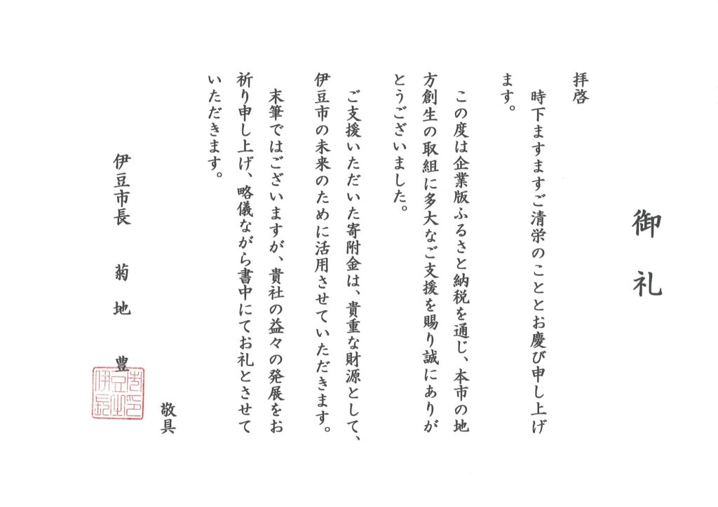 静岡県伊豆市と静岡市へ企業版ふるさと納税による寄附を行いました