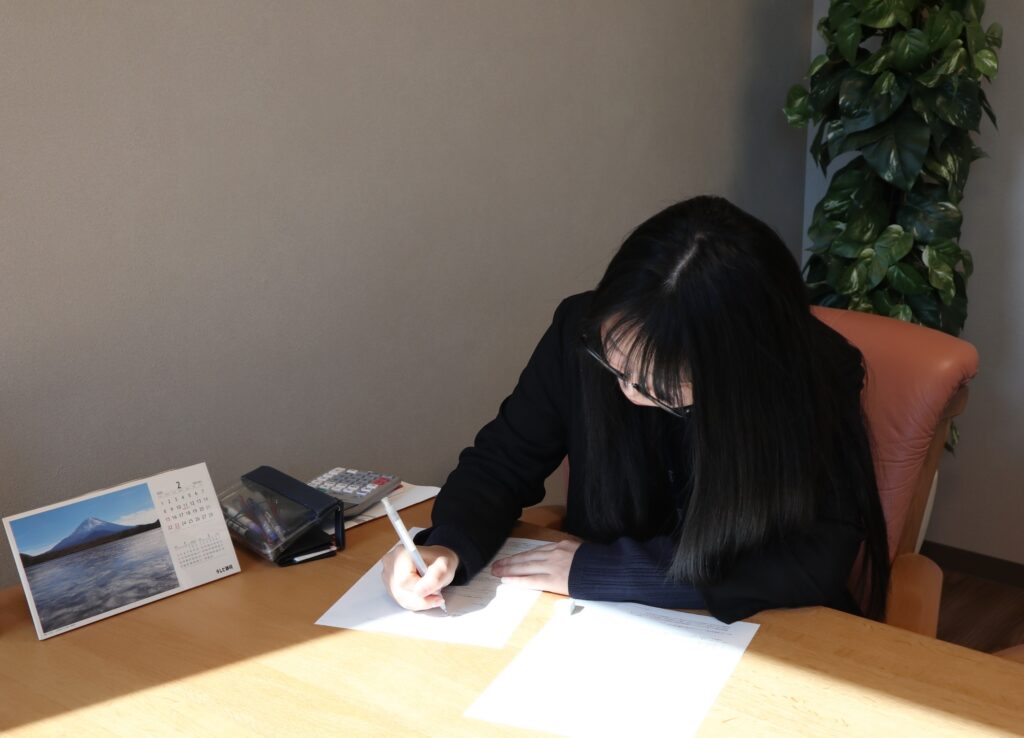 社内では、試験に向けて先輩社員と確認しながら勉強に励む様子が見られました。
